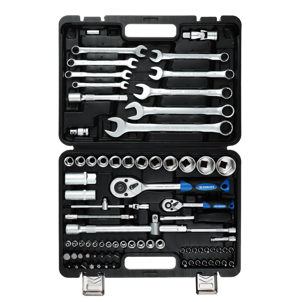 Набор автомобильных инструментов РОКОТ из 83 предметов включает в себя все самое необходимое: отвертки, гаечные ключи, набор бит с держателями, удлинители торцовых головок и многое другое. Все предметы изготовлены из качественной прочной закаленной стали, что гарантирует долгий срок службы. Удобный кейс надежно закрывается на замки и имеет ручку для переноски. Его можно компактно хранить как в гараже, так и в автомобиле.