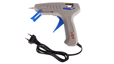Клеевой пистолет предназначенный для склеивания различных материалов, таких как бумага, ткань, пластик, дерево и другие. Он состоит из корпуса, нагревательного элемента, механизма подачи клея и сопла. Внутрь пистолета вставляется клеевой стержень, который при нагревании расплавляется и подаётся через сопло.. Клеевые пистолеты используются в рукоделии, радиотехнике, строительстве и бытовом ремонте для склеивания различных материалов, таких как дерево, металл, резина, пластик, керамика и других. Работает от сети.